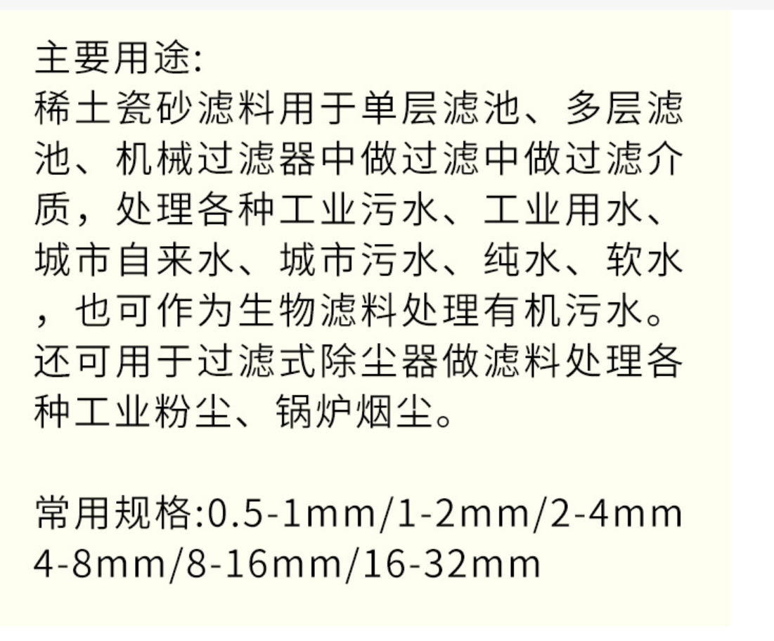 稀土瓷砂濾料廣泛用于濾池,有效的處理各種進(jìn)水和污水,還可以用于煙氣除塵器中做濾料,過濾除去各種工業(yè)粉塵和鍋爐煙塵。